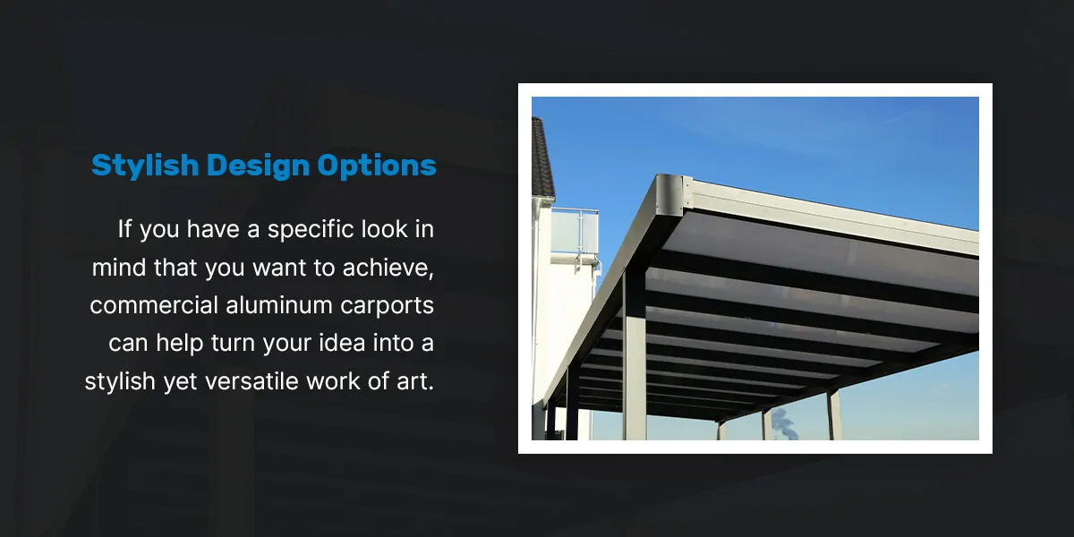 If you have a specific look in mind that you want to achieve, commercial aluminum carports can help turn your idea into a stylish yet versatile work of art. It offers many design options to fit modern, minimalistic aesthetics and add to your property’s curb appeal. Enjoy the best of both worlds with a stylish design and durable covering.